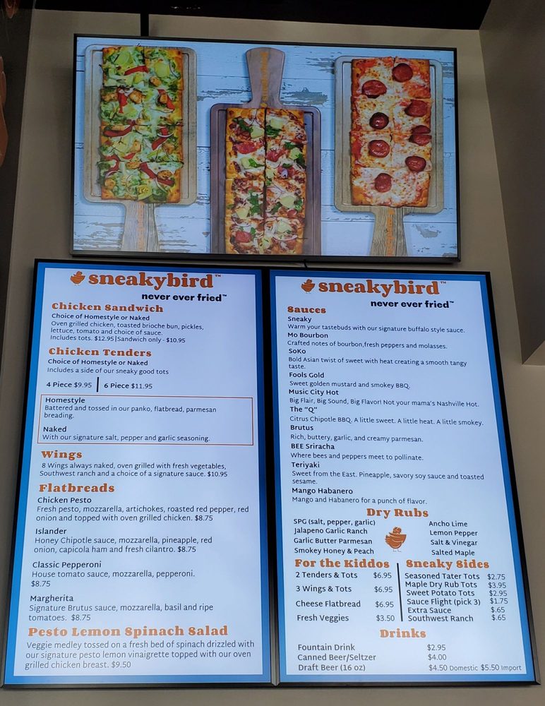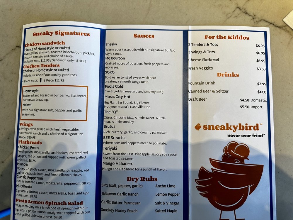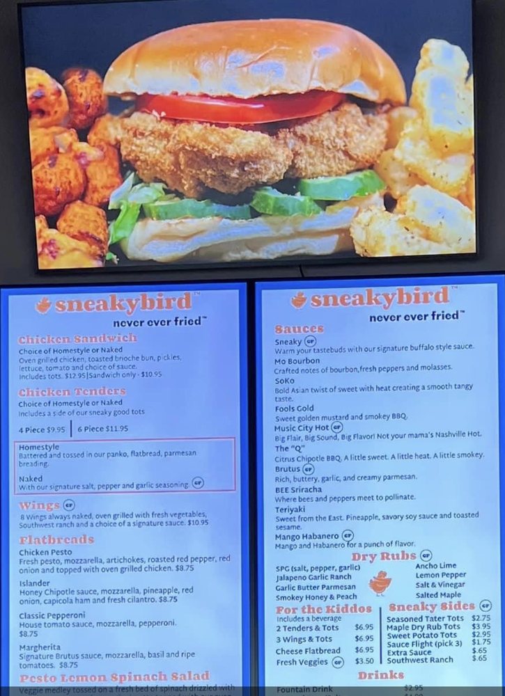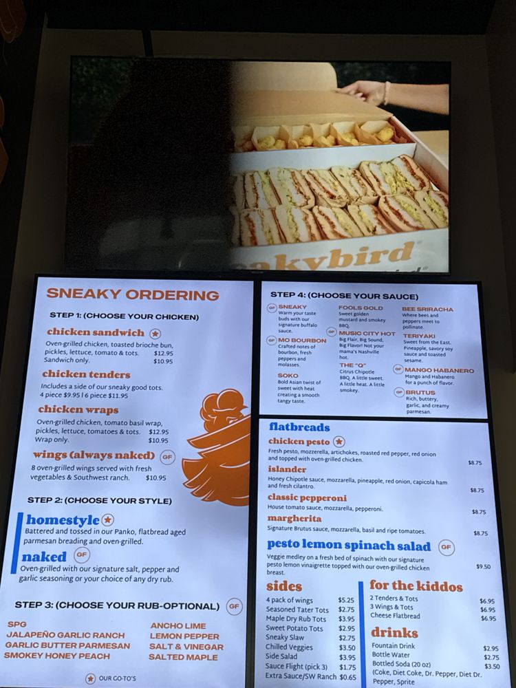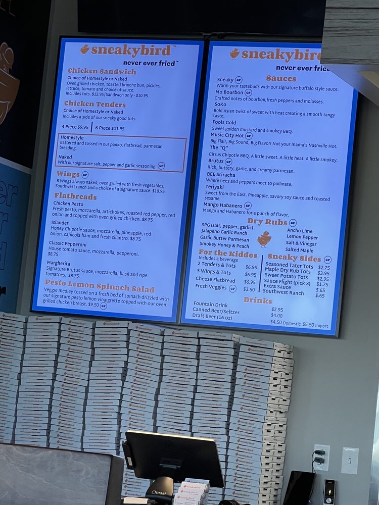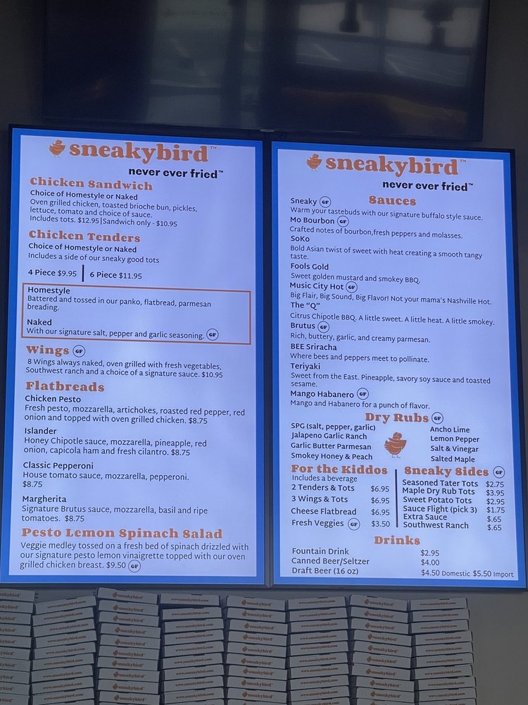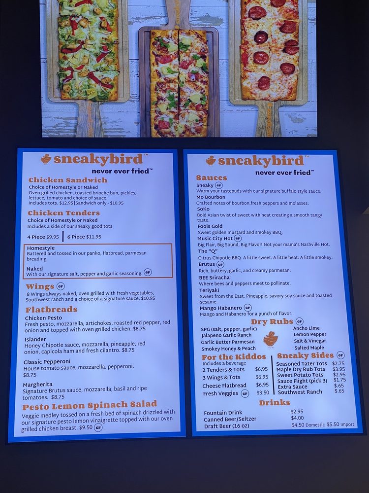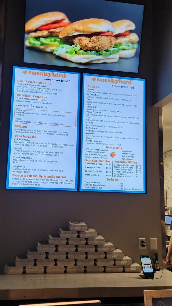 Customers rave about the flavorful dishes, with highlights including the baked wings, spicy chicken sandwiches, and sweet potato tots. The friendly staff and quick service add to the overall dining experience, making it a great spot for casual lunches or dinners. Whether you're a fan of traditional wings or looking for a healthier option, sneakybird caters to all tastes. Give their extensive list of sauces a try and don't miss out on their happy hour specials. Visit sneakybird for a dining experience that combines great food with excellent service.